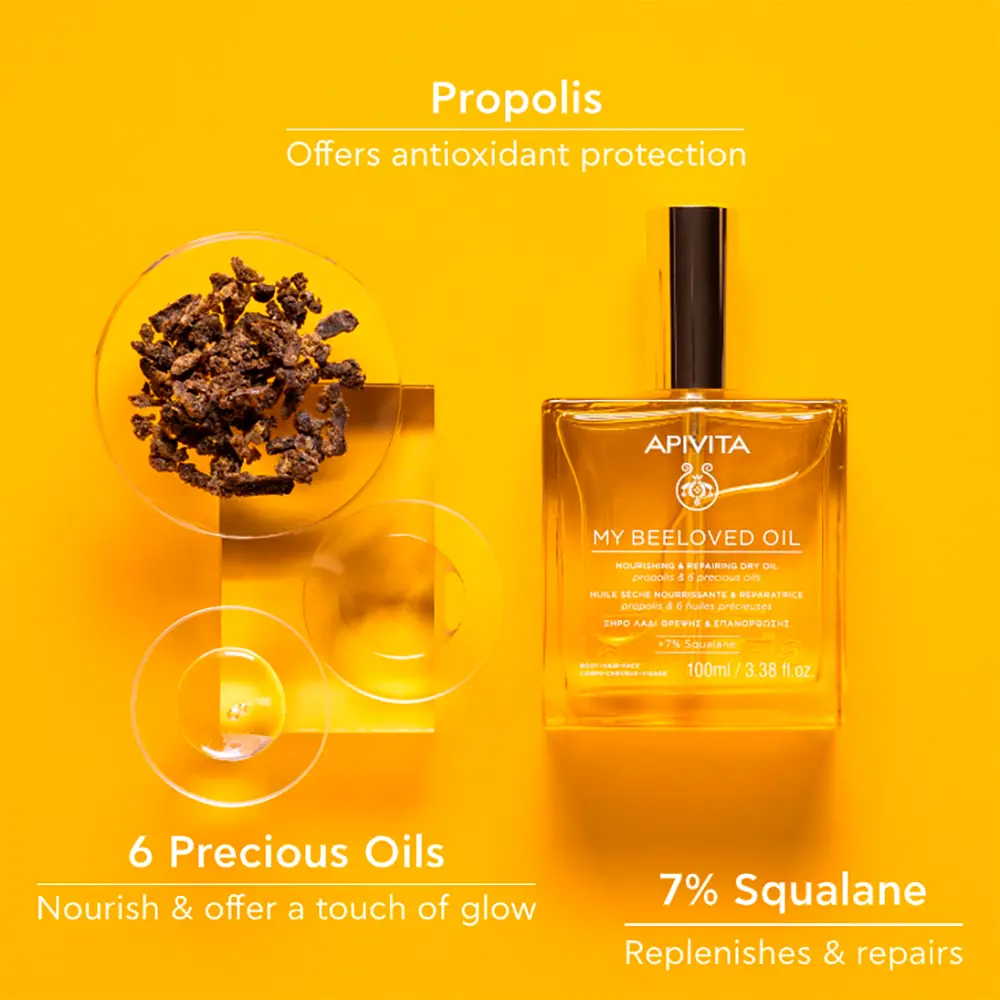 Un olio secco sensoriale che avvolge la pelle, lasciandola delicatamente profumata e con un effetto luminoso . Con il 7% di squalano per rigenerare la pelle, propoli e 6 oli preziosi che forniscono nutrimento, protezione e riparazione, preservando la luminosità giovanile della pelle e dei capelli.