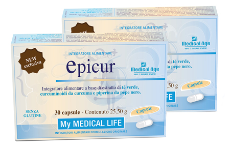 Integratore alimentare a base di estratto di tè verde, curcuminoidi da curcuma e piperina da pepe nero.