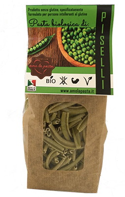 Pasta biologica e vegana, a base di farina di piselli e farina di riso, specificatamente formulata per persone intolleranti al glutine, trafilata al bronzo a bassa pressione, essiccata in più di 15 ore.