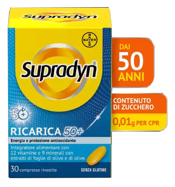 Integratore alimentare di vitamine e minerali con estratti di foglie di olivo e di olive specificatamente formulato per fornire un adeguato apporto di micronutrienti particolarmente utili per le esigenze degli adulti dai 50 anni in su.